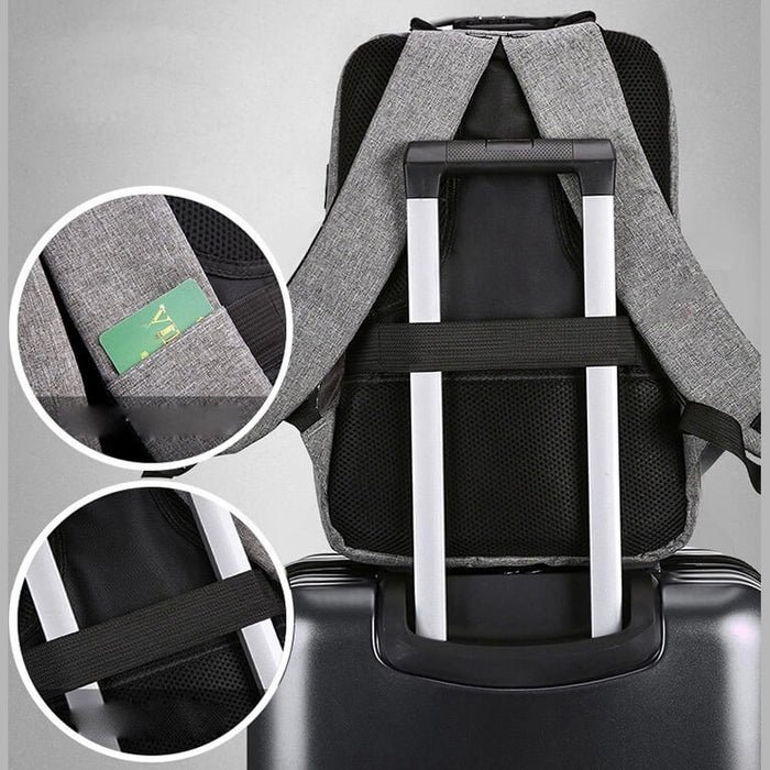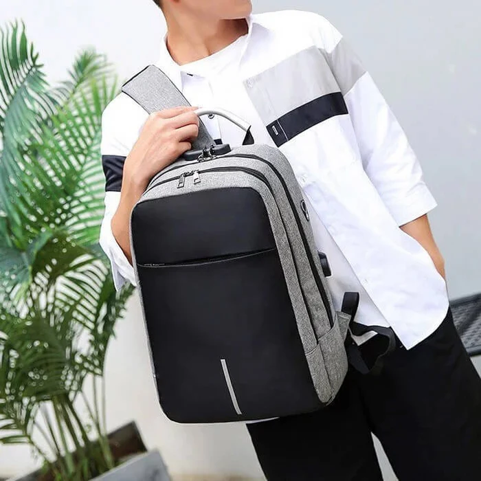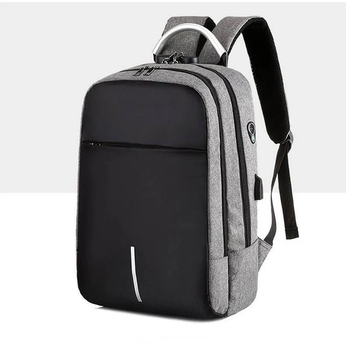 Morral en lona liner, manija en aluminio, seguro de apertura, cable USB, bolsillo para laptop, orificio para audífonos, espaldar acolchado, bolsillo en la manija.
